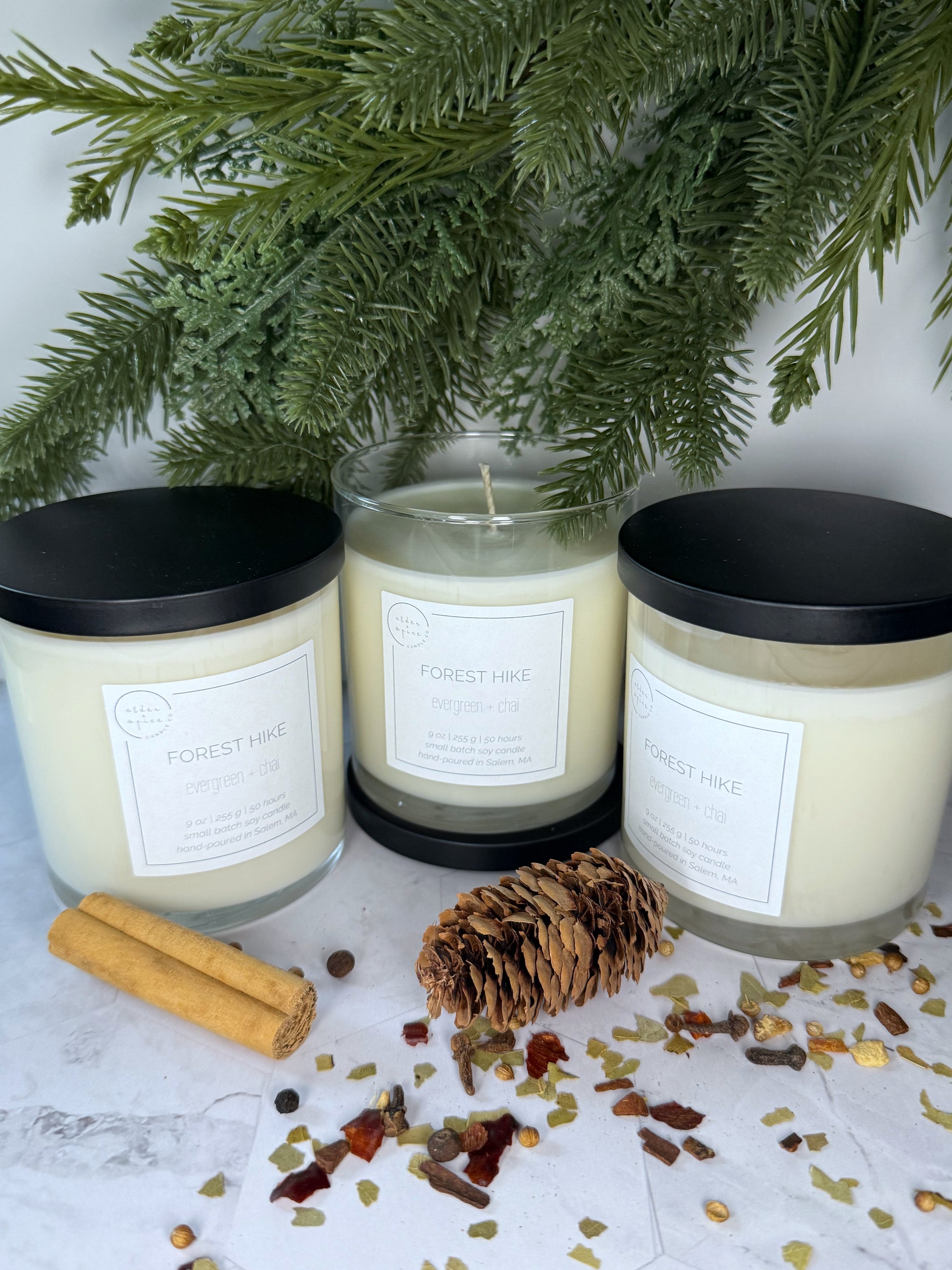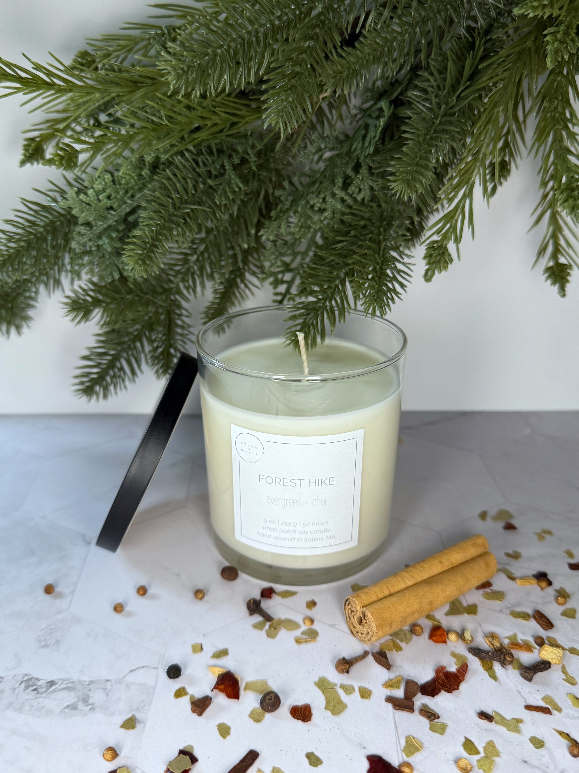 Indulge in the refreshing scent of evergreen, apple, and warm chai while burning Forest Hike. This unique scent helps you escape the everyday to a serene woods (no bears included!)
