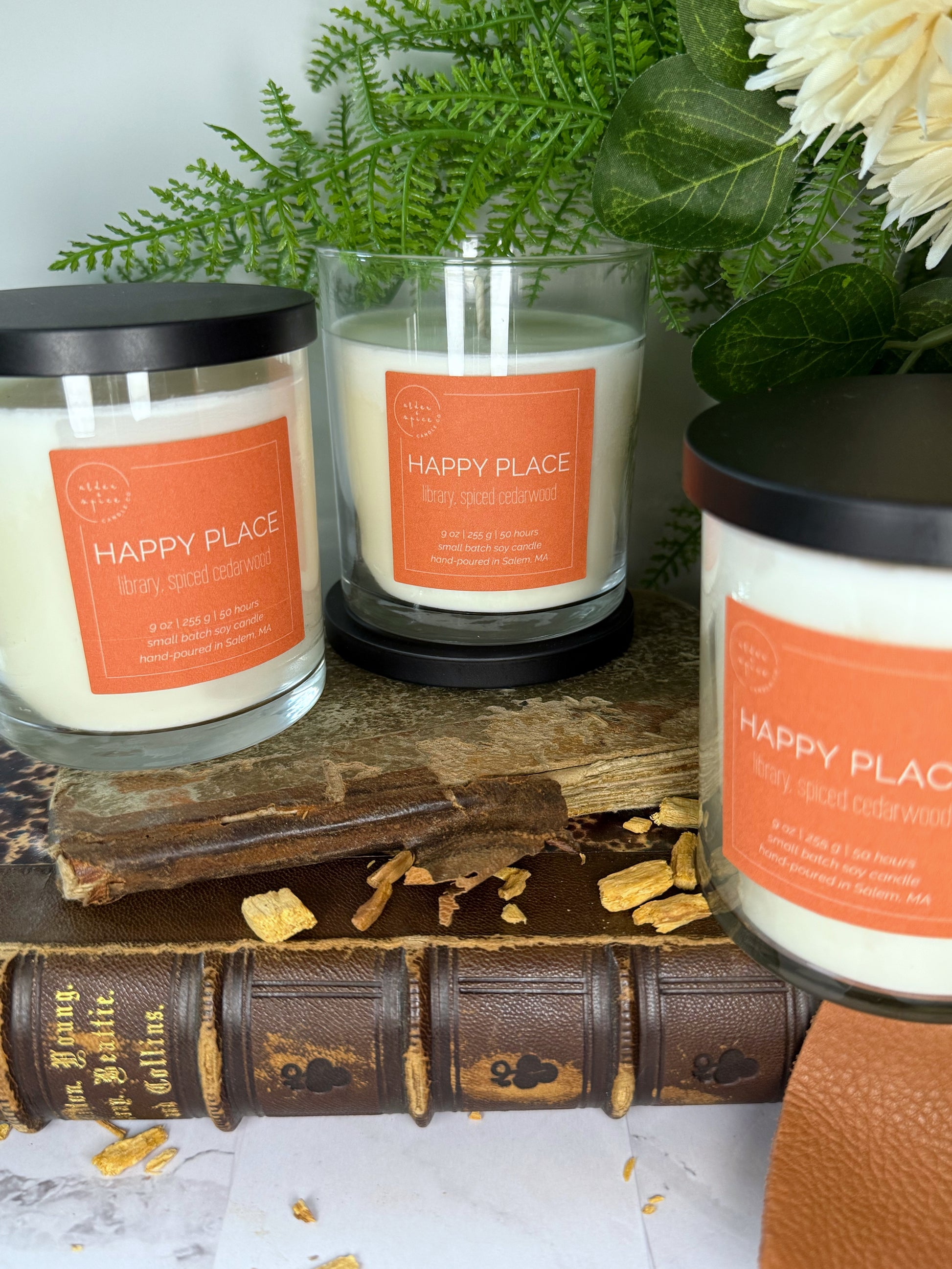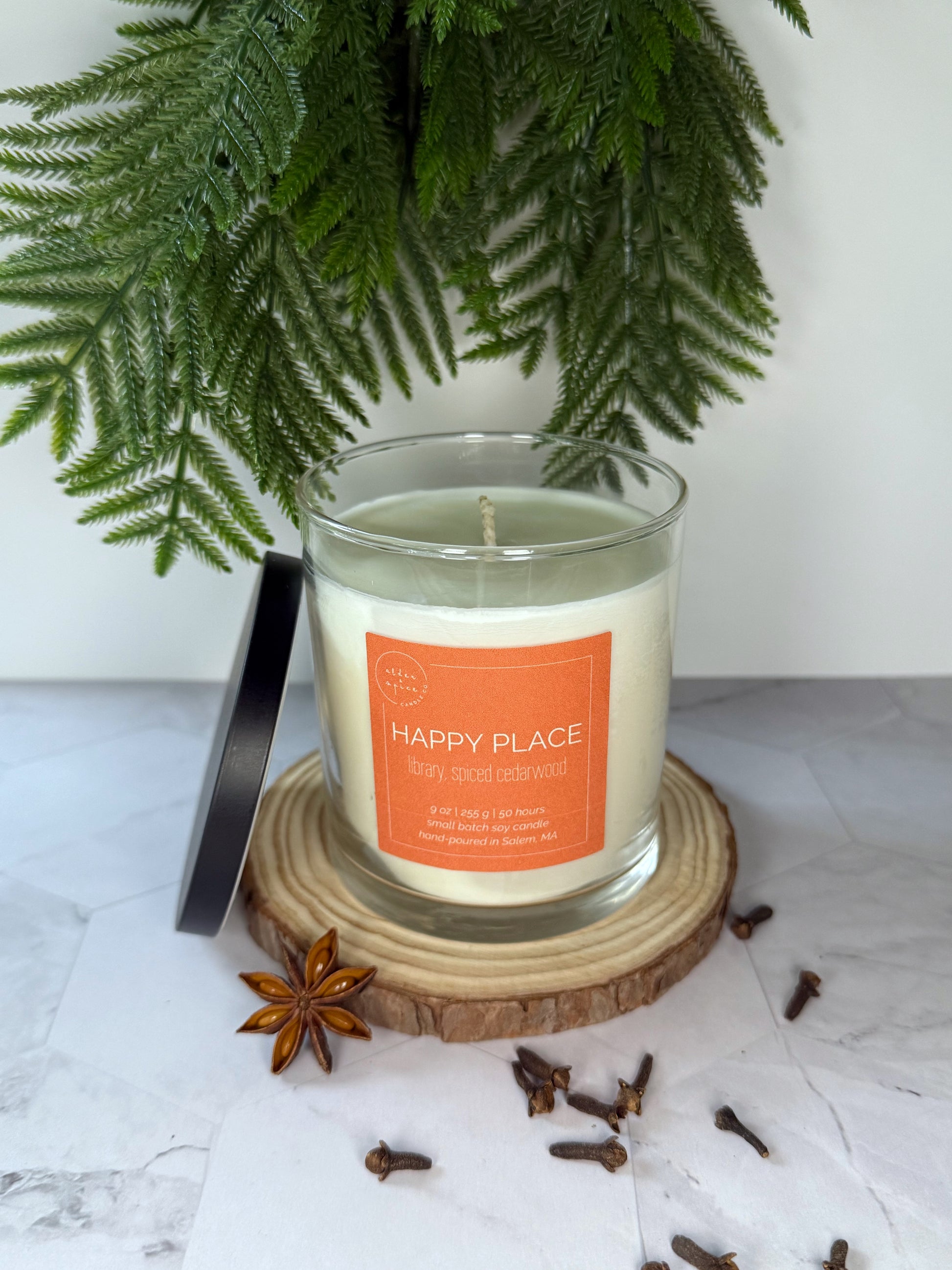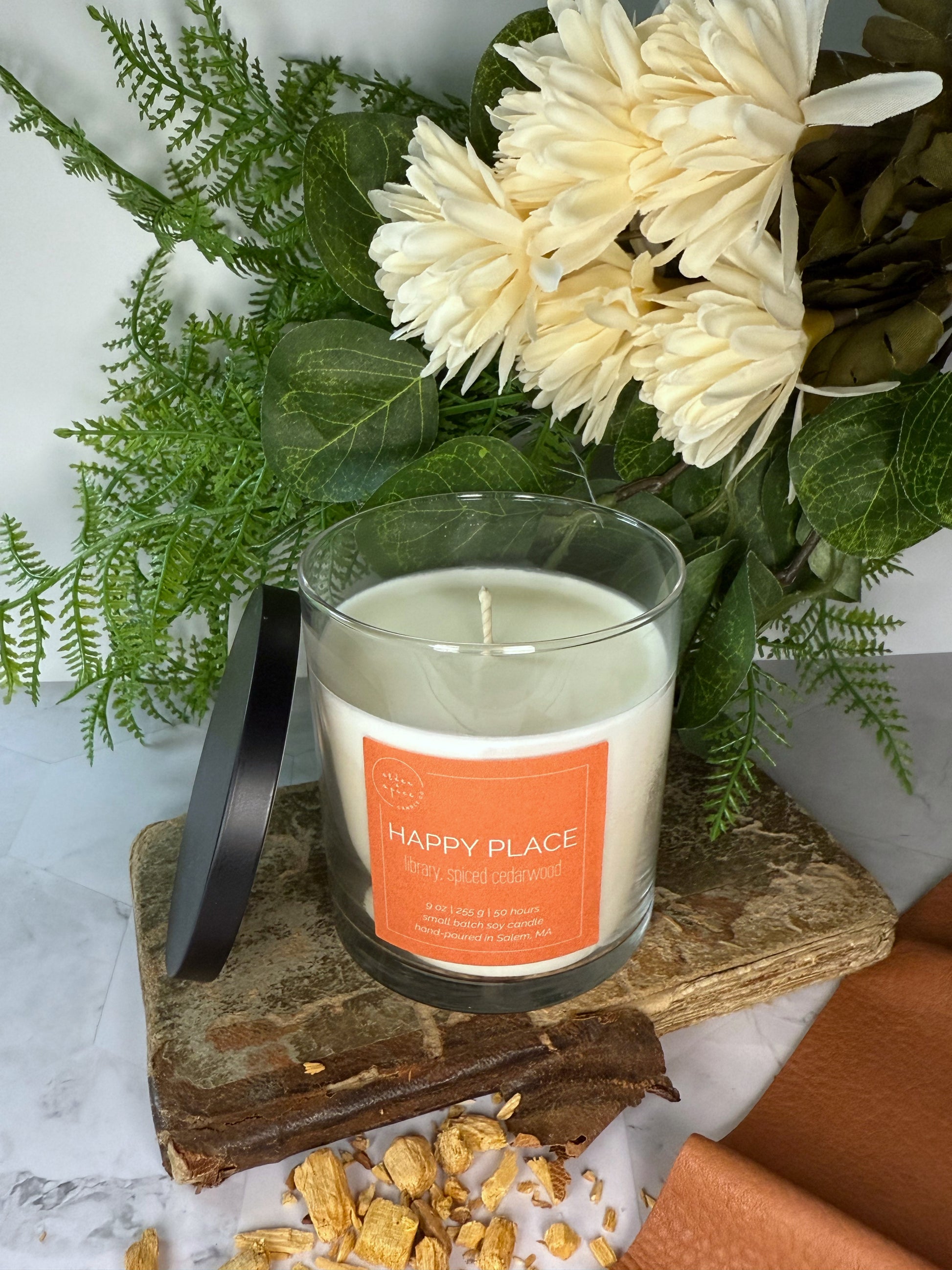 Find your Happy Place with a warm blend of teakwood, leather, musk, and saffron. Light it and snuggle up for a cozy night in.