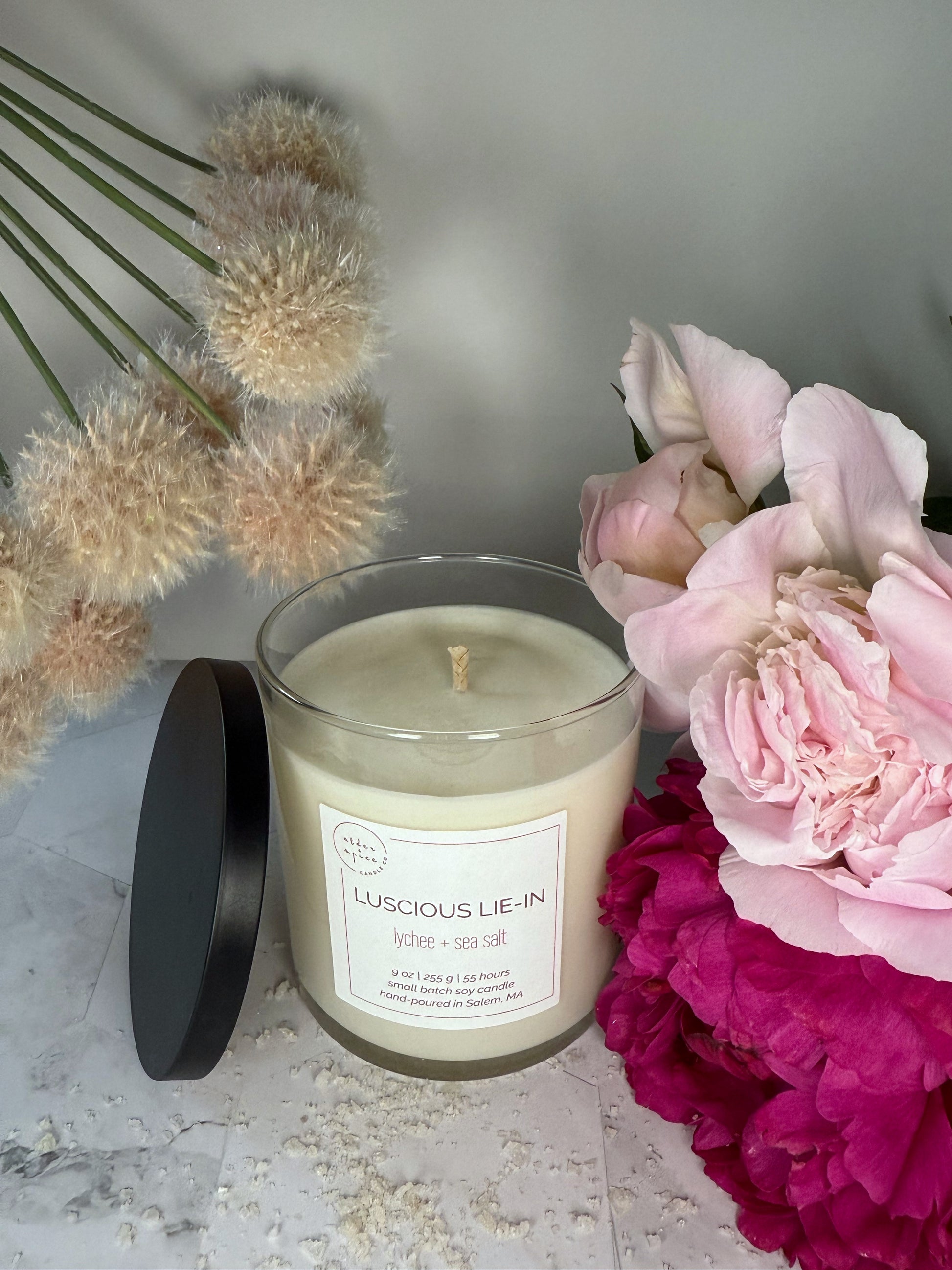 Experience a playful escape with Luscious Lie-In. This luxurious scent combines exotic lychee and black sea salt notes. Unwind and indulge in a moment of sweet, refreshing relaxation with this lovely candle!