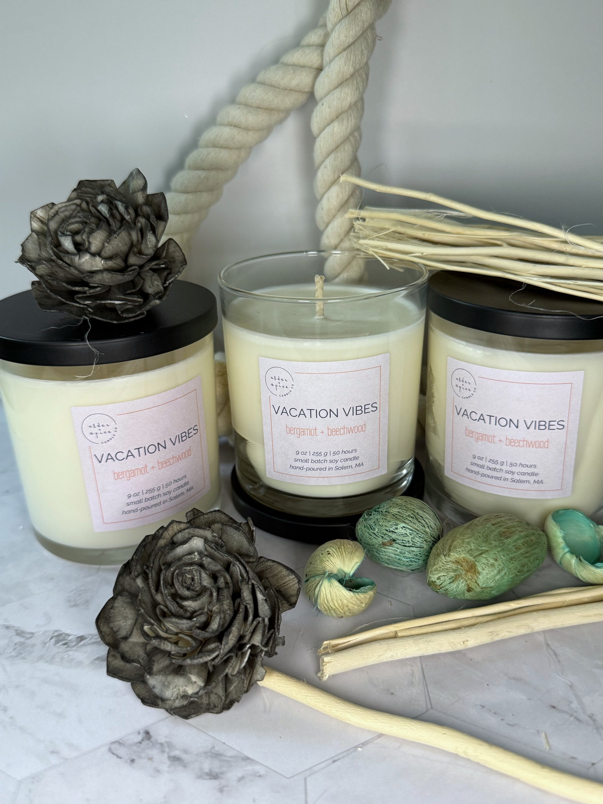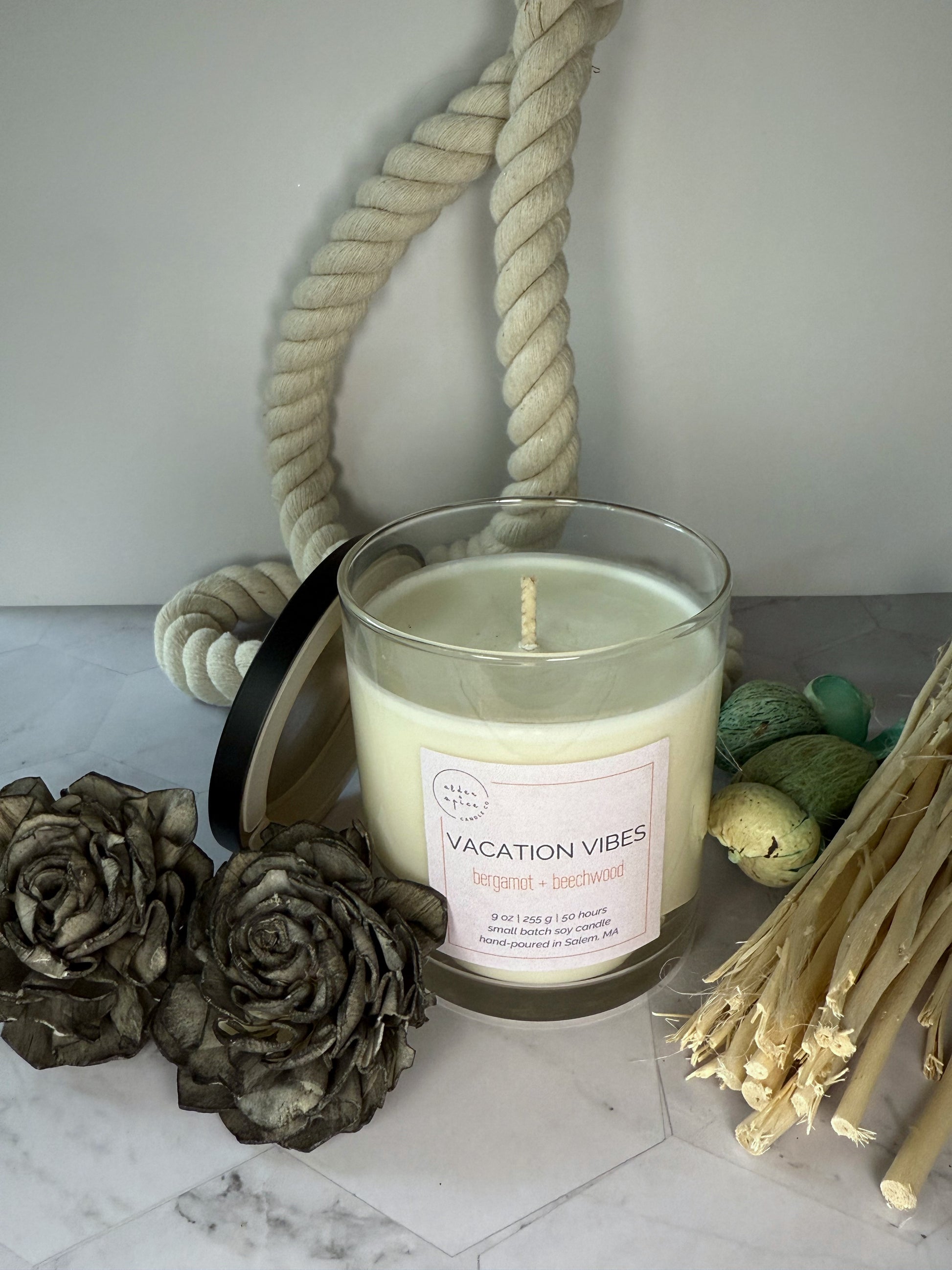 Indulge in a tropical paradise right in your own home with Vacation Vibes. Let the scents of orange, bergamot, and coconut transport you to a tranquil beach, while notes of amber, vanilla, and beachwood create a warm and cozy ambiance. Ultimate relaxation awaits!
